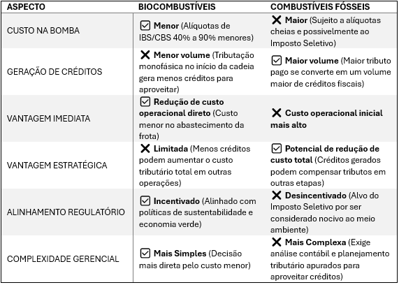 Já os combustíveis fósseis, embora com alíquotas maiores, com base no Imposto Seletivo, vão gerar maior volume de créditos. Com isso, a escolha do combustível para as frotas não será apenas com base no preço, mas envolverá uma complexa equação tributária.